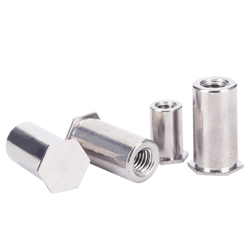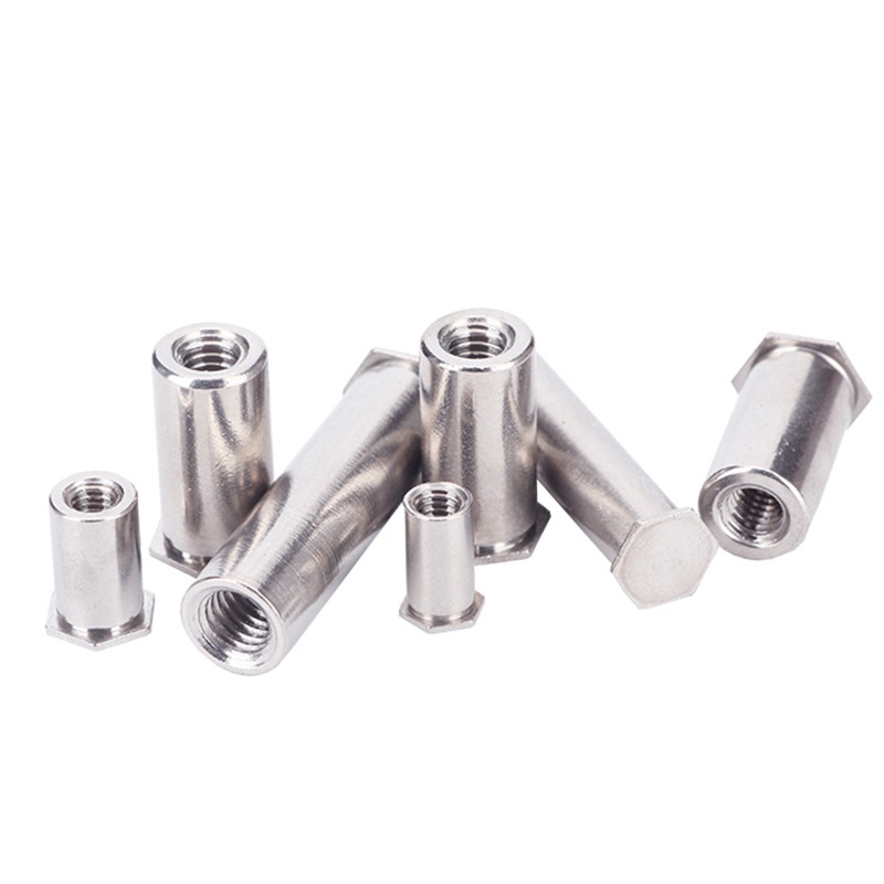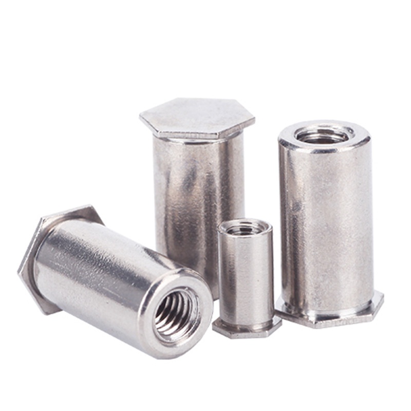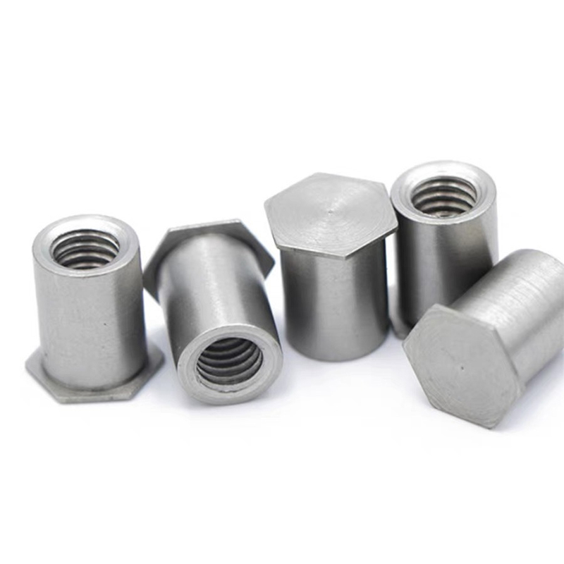 Poll dall ceann cothrom heicseagáin Déantar cruach charbóin cnó-charbóin a dhéanamh le caighdeáin dhianmhéide cosúil le ASME B18.7 nó DIN 7337, ionas gur féidir iad a mhalartú go héasca. I measc na bpríomhthoisí tá an méid snáithe (cosúil le M3 go M12), trastomhas an chinn agus uillinn (de ghnáth 90 ° Cuntersink), leithead heicseagáin (AF tomhas), agus an raon greim (cé chomh tiubh is féidir leis an ábhar a bheith). Tagann na cnónna seamaithe seo i gcineálacha snáithe méadracha agus impiriúla araon. Clúdaíonn specs tábhachtacha doimhneacht an phoill dall agus méid an bhairille rivet freisin.