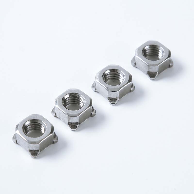 Níl dearadh poll uilleach ag cnónna cearnach táthú Aicme 5 de chineál 1D. Ina áit sin, tá protrusion beag agus ardaithe deartha ag bun an leathanaigh. Tá siad deartha go sonrach le haghaidh táthú spot friotaíochta. Brúigh na leictreoidí síos, agus sreabhann an sruth tríd an limistéar ardaithe. Leánn agus comhleádaíonn an t-achar ardaithe an cnó leis an mbunmhiotal láithreach.