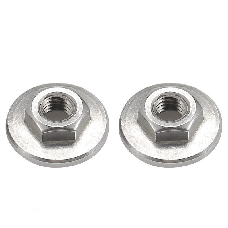 Is é an chuid is suntasaí den chnó seo an flange ionsuite - is fáinne cothrom níos leithne é atá ceangailte leis an bpríomhchorp cnó. Feidhmíonn an flange cosúil le níocháin ionsuite, mar sin ní gá duit ceann a chur leis ar leithligh. Tá an príomhchorp sorcóireach, le snáitheanna inmheánacha caighdeánacha a mheaitseálann boltaí méadracha nó impiriúla.