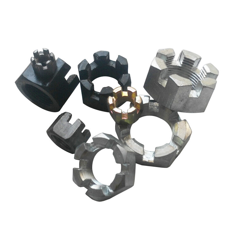 Is iondúil go ndéantar cnó coróin cruinnithe le sliotán as cruach charbóin láidir nó cruach chóimhiotail-cosúil le grád 5, grád 8, nó AISI 4140. Tugann an mhaoin seo déine den scoth dóibh, agus déanann siad go maith sna trí phríomh-airíonna meicniúla de neart teanntachta, neart táirgeachta agus neart lomadh. Ciallaíonn a bheith déanta as cruach láidir gur féidir leis na cnónna seo a lán fórsa clampála agus strus a láimhseáil ó úsáid gan lúbadh nó briseadh. Sin an fáth go n-oibríonn siad go maith le haghaidh post ualach trom in áiteanna diana-cosúil le frámaí struchtúracha, drivetrains, agus páirteanna fionraí.