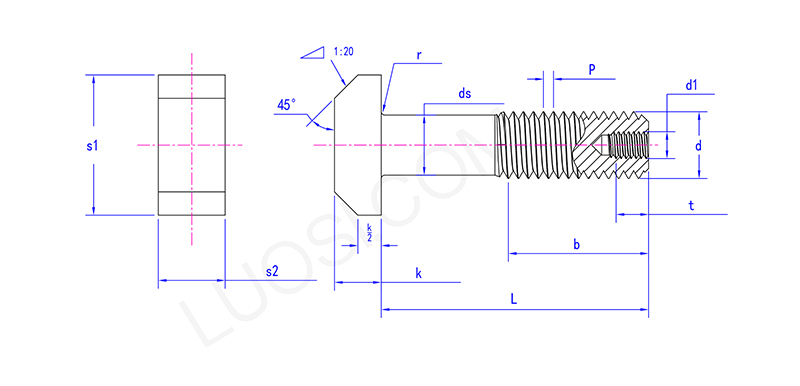 Tá ceann an bholg laghdaithe le poll cosúil le rombas agus is féidir é a bheith greamaithe sa sliotán T le bheith socraithe agus gan rothlú. Tá an chuid lárnach dá scriú níos tanaí, is é sin, an "slat shrunken", agus tá poll druileáilte freisin ag bun an scriú. Tá an taobh istigh log.