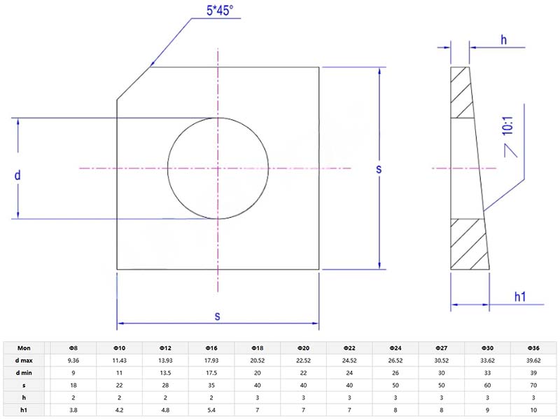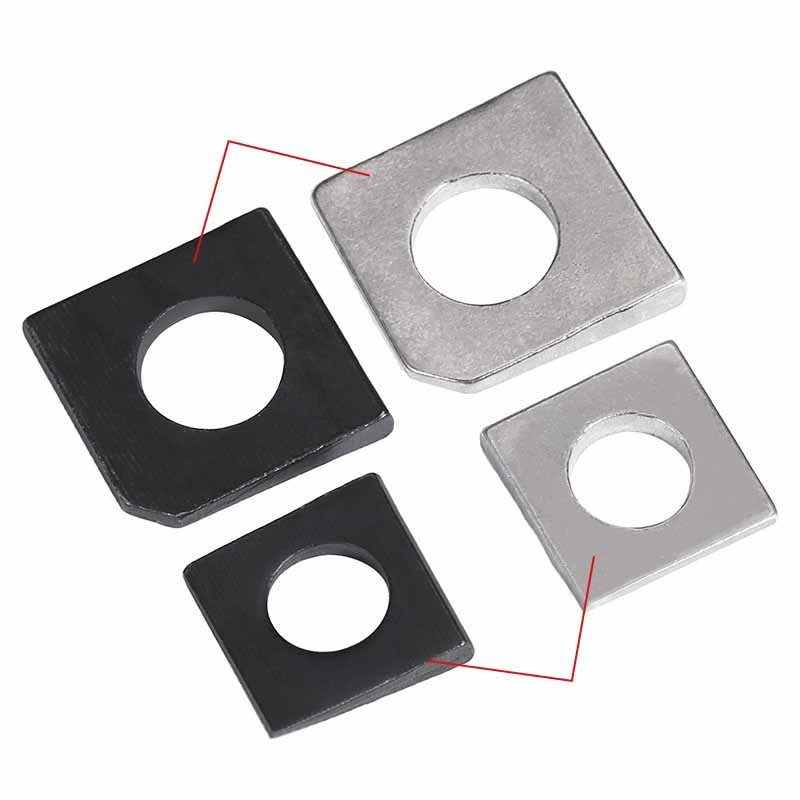 Tagann an washer claonta cearnógach i méideanna caighdeánacha agus is féidir é a dhéanamh saincheaptha chun riachtanais éagsúla tionscadail a chur in oiriúint. Tá trastomhas inmheánach ag méideanna caighdeánacha ó 1/4 "go 2", le tiús idir 1.5mm agus 6mm. Is iondúil go n -oireann an chuid chearnóg sheachtrach do mhéideanna ceann bolt ionas go n -oibríonn siad le chéile. Is féidir leat leaganacha saincheaptha a fháil le huillinneacha bevel speisialta nó le méideanna níos mó le haghaidh post tromshaothair. Soláthraíonn siad líníochtaí mionsonraithe agus specs méide chun a chinntiú go bhfuil na leicneáin oiriúnach go maith le córais ceanglóra atá ann cheana féin.